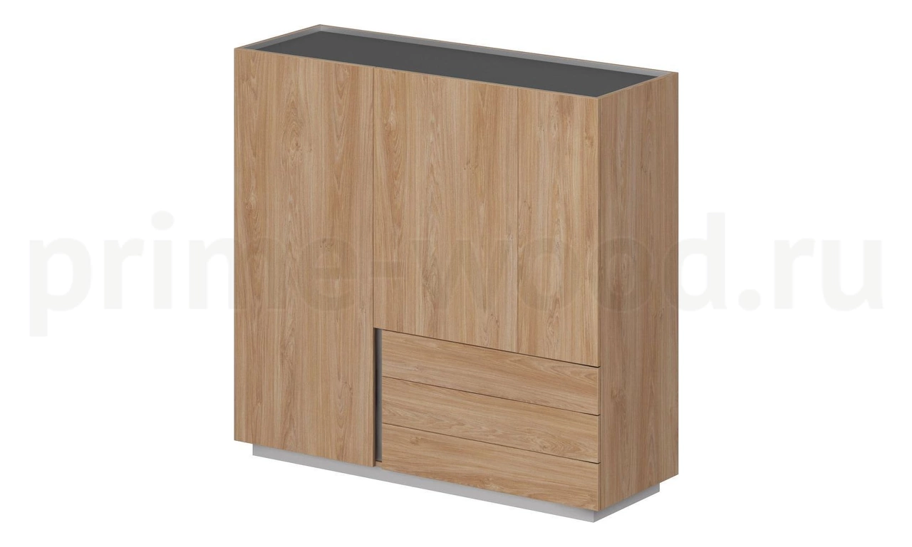 Шкаф на регулируемых опорах с 3-мя ящиками и 2-мя распашными фасадами. Шкаф имеет ориентацию - правый и левый. В секции за широким высоким распашным фасадом - выдвижная штанга (премиум сигмент). В этой же секции есть присадка для установки трёх дополнительных полок (опционально). В шкафу присутствует присадка для установки трёх дополнительных полок (опционально). Комплект из 3-х полок заказывается отдельно. В секции за низкими распашными фасадами по две полки.